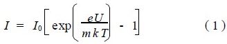 式中m 為復(fù)合因子, I0為反向飽和電流, UT =kT/e 稱為溫度電壓當量,在熱力學(xué)溫度T = 300 K時,UT = 26 mV1 在寬禁帶半導(dǎo)體中, 當I <0. 1 mA時,通過結(jié)內(nèi)深能級進行復(fù)合的空間復(fù)合電流起支配作用,這時m = 2 ;電流增大后擴散電流占優(yōu)勢時m = 1.U 為外加電壓。