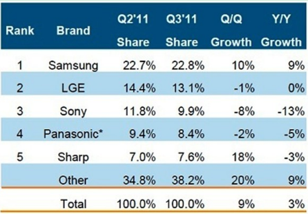 - 2011年第三季三星電視營(yíng)收市占率為22.8%