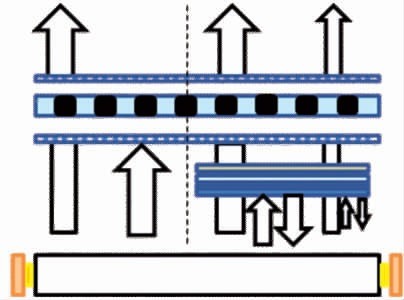 為了使用盡可能少的LED而又保持良好的光學特性,本文設計的LED背光選用了1層擴散膜、2層棱鏡膜和1層雙層增亮膜(DBEF),膜材參數(shù)如表1所示。擴散膜可以改變LGP出射的光路,讓射出的光更加均勻;還可以隱藏LGP 上的dot,使從正面看不到散射點的影子,擴大視野角,提升輝度。棱鏡膜即增亮片,主要利用全反射和折射定律,將分散的光集中于一定角度范圍內(nèi)出射,從而提高該范圍內(nèi)的亮度。DBEF 是本文LED背光模組的關(guān)鍵膜材,可以使整個模組的亮度提升一倍,其工作原理如圖2所示。DBEF可以將不能通過下偏光片的光線反射回背光,經(jīng)背光的二次反射,部分光線又可以通過DBEF和下偏光片出射。經(jīng)過多次回收和利用,光的透過率得以大幅提高。