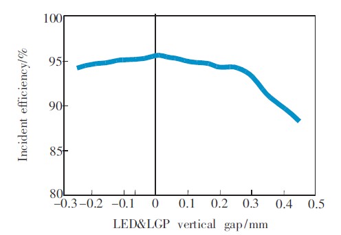 LED發(fā)光面和LGP入光面兩者之間的垂直距離通常會被忽略,但如果兩者之間的距離過大,也會嚴重影響入射效率。通過試驗發(fā)現(xiàn),兩者之間的距離在±0.2mm范圍內(nèi)時,入射效率變化緩慢,且保持在95%左右,所以控制LED發(fā)光面和LGP入光面的垂直距離在±0.2mm范圍內(nèi)即可。