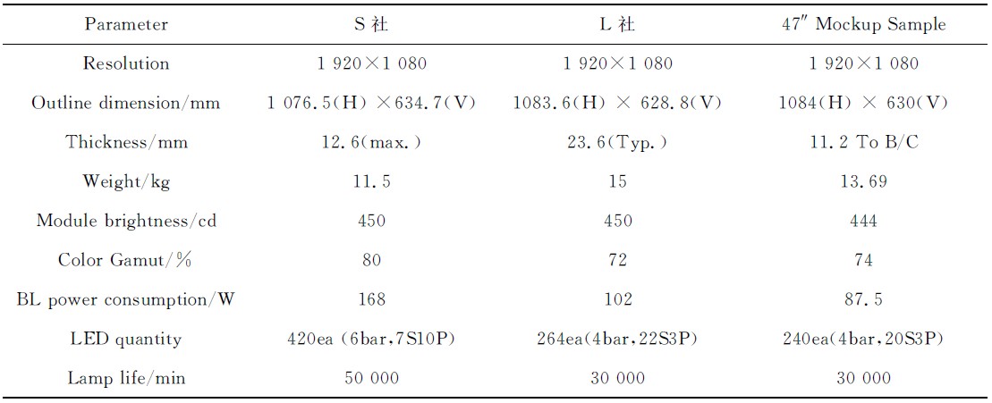 本文中設計的樣品在保證了光學性能的前提下,實現(xiàn)了低功耗的目標,達到了《平板電視能效限定值及能效等級》中規(guī)定的一級能耗,產(chǎn)品的厚度和色域也具有一定的優(yōu)勢。