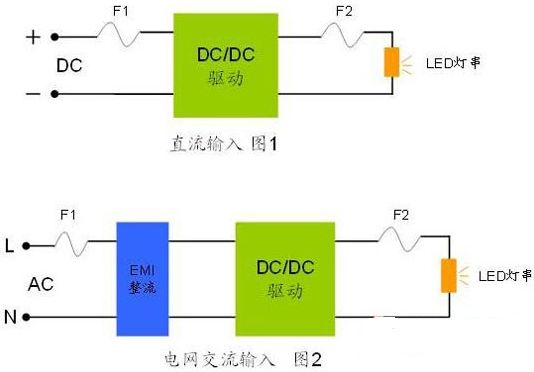 面對(duì)LED照明的眾多應(yīng)用領(lǐng)域,由于市場(chǎng)并沒有形成統(tǒng)一的規(guī)范,存在多種多樣的驅(qū)動(dòng)解決方案,但是萬(wàn)變不離其中,從過流保護(hù)的角度來看大體上根據(jù)燈體的輸入電流來可以分為:直流輸入和電網(wǎng)交流輸入兩種最基本的類型,兩種類型的主要區(qū)別在于驅(qū)動(dòng)電源是否有交流轉(zhuǎn)直流的模塊。當(dāng)然市場(chǎng)上也有很多電阻、阻容降壓等低成本解決方案,沒有EMI整流和恒流驅(qū)動(dòng)的模塊,但是由于初級(jí)端保險(xiǎn)絲的選用要求與圖2是一致,在此歸入第二種類型。