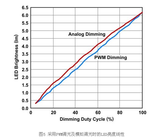 此外,驅(qū)動器可達到較高的光電轉(zhuǎn)換效率,這表示耗用相同的電力可達到更高的流明。然而,模擬調(diào)光也有深度調(diào)光的某些電流準確度問題,此因回饋調(diào)節(jié)電壓或電流汲入電壓過小,而無法準確控制,此乃受限于錯誤放大器的偏移電壓所致。亮度線性及色度也不比PWM調(diào)光,尤其是在深度調(diào)光時(圖5)。事實上,除非將兩個相同的顯示器并置進行比較,否則一般人很難辨別色度或線性的差異。
