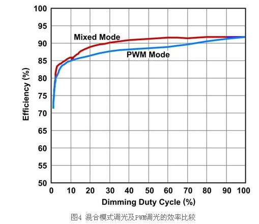 由于升壓轉(zhuǎn)換器須要提供較低的輸出電壓,因此輸入電源需求會降低并使效率提高(圖4)。在混合模式調(diào)光中,驅(qū)動器執(zhí)行D最低達到6.25%的模擬調(diào)光,接著轉(zhuǎn)換為PWM調(diào)光,以提高亮度線性。