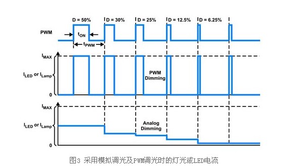 為提升顯示效果,并優(yōu)化不同環(huán)境照明亮度的LED驅(qū)動器效率,較新型LED背光電子裝置能達到較大的調(diào)光范圍。有兩種方法可用于LED調(diào)光:脈沖寬度調(diào)變(PWM)調(diào)光及模擬調(diào)光(圖3)。