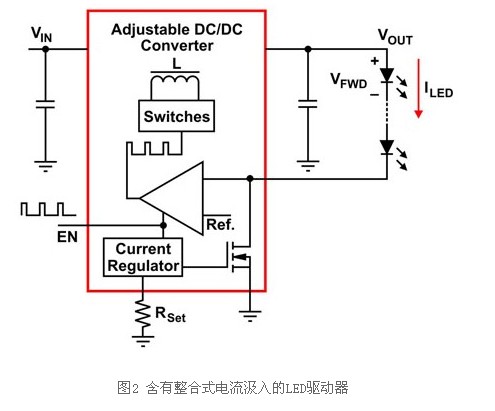 為了進行PWM調(diào)光,數(shù)字信號處理器(DSP)或微控制器(MCU)會傳送不同負載周期(D)的PWM訊號,以針對圖1所示的驅(qū)動器啟用及停用WLED驅(qū)動器的轉(zhuǎn)換器,或針對圖2所示的驅(qū)動器啟用及停用電流汲入。因此,通過WLED串行的平均電流等于負載周期乘以最大電流,亦即ILEDavg = D×ILEDmax。