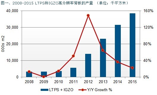 根據(jù)NPD DisplaySearch TFT LCD制程技術(shù)藍(lán)圖趨勢報(bào)告(TFT LCD Process Roadmap Report)指出,2012年高移動(dòng)速率TFT-LCD背板產(chǎn)量預(yù)計(jì)將提高150%,從2011年的560萬平方米迅速發(fā)展到1千410萬平方米。如此高成長的驅(qū)動(dòng)力主要在于許多五代線和更大的低溫多晶硅(LTPS)產(chǎn)線于2012年開始投入生產(chǎn),且夏普、樂金顯示和三星現(xiàn)有的產(chǎn)線也投入生產(chǎn)金屬氧化物(IGZO)。