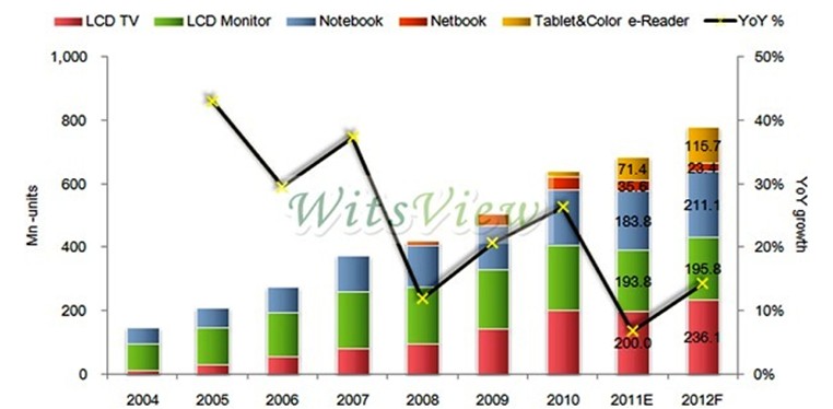 在low cost direct type LED TV、 3D TV 、super narrow bezel、 LED Monitor 、ultra slim module、high resolutiON、new TV sizes、high transmittance panel、 Windows 8 等新產(chǎn)品及新作業(yè)系統(tǒng)的帶動下,WitsView對于2012年大尺寸面板的需求抱持著審慎而樂觀的看法,預(yù)估年成長率將達12~14%,面板總量上看7億8,000萬片,其中平板電腦及彩色閱讀器面板的年成長率仍將超過60%,達1億1,500萬片。