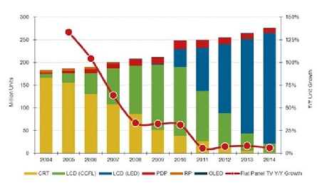 2004-2014全球電視按技術(shù)別出貨量及預(yù)測(單位:百萬臺(tái))