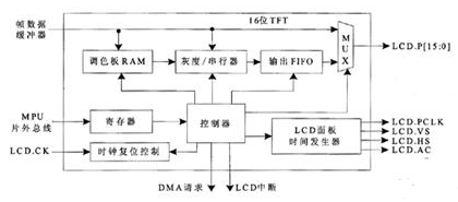 OMAP5910內(nèi)部具有獨立的LCD控制模塊,其功能如圖1所示。從圖中可以看出LCD控制模塊的核心單元是控制器,負責(zé)和其他各個部分的控制以及和外設(shè)的連接??刂破鬟B接兩個外設(shè),一個是到OMAP5910的DMA請求,一個是到外設(shè)的LCD的中斷請求。這樣,0MAP5910作為主設(shè)備,可以在CPU不參與的情況下實現(xiàn)對LCD的顯示核控制。LCD作為被動設(shè)備,有少量需要返回的狀態(tài),發(fā)送中斷到OMAP5910,由OMAP5910安排時間讀取LCD狀態(tài)。這樣,使得整個LCD的顯示和控制占用較少的CPU資源。