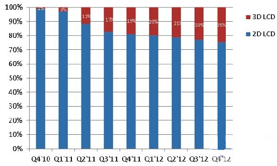 根據(jù)NPD DisplaySearch的調(diào)查,在元旦期間的主要城市賣場(chǎng),3D液晶電視在零售終端滲透率甚至高達(dá)40%;而整體3D液晶電視出貨滲透率可望在2012年第一季超過(guò)20%;該機(jī)構(gòu)在全球電視出貨與預(yù)測(cè)季報(bào)(Quarterly Advanced Global TV Shipment and Forecast Report)中預(yù)測(cè),到2012年第四季,中國(guó)大陸 3D液晶電視滲透率可達(dá)25%。