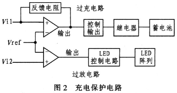 充電保護(hù)電路由兩個(gè)運(yùn)算放大器組成,電路如圖2所示。圖2中Vi1、Vi2分別為蓄電池的輸出電壓,Vref為運(yùn)算放大器的比較參考電壓,其具體值根據(jù)不同的要求由用戶(hù)設(shè)定。在實(shí)際設(shè)計(jì)過(guò)程中,要注意圖2中反饋電阻的選取,反饋電阻越大,控制輸出所對(duì)應(yīng)的輸入Vi回差值越小。