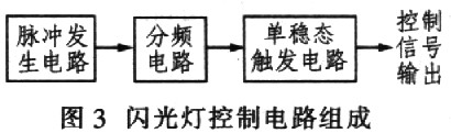 控制電路需要根據(jù)不同的要求進(jìn)行不同的設(shè)計(jì)。對(duì)于閃光功能變化復(fù)雜的控制電路可使用MCU單片機(jī)進(jìn)行控制,這樣控制方便、簡(jiǎn)單、穩(wěn)定。由于本系統(tǒng)設(shè)計(jì)只要求閃光燈定時(shí)閃爍,功能單一,故采用簡(jiǎn)單的純硬件電路實(shí)現(xiàn)。電路組成如圖3所示。
