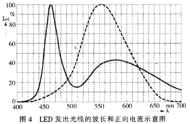 白光LED設(shè)計(jì)中采用了一個(gè)小竅門(mén)。在發(fā)射藍(lán)光的InGaN基料上覆蓋轉(zhuǎn)換材料,這種材料在受到藍(lán)光激勵(lì)時(shí)會(huì)發(fā)出黃光。于是得到了藍(lán)光和黃光的混合物,在肉眼看來(lái)就是白色的,圖4為L(zhǎng)ED發(fā)出光線(xiàn)的波長(zhǎng)和正向電流示意圖。由圖4可以看出:白光LED的發(fā)射波長(zhǎng)(實(shí)線(xiàn))包括藍(lán)光和黃光區(qū)域的峰值,但是在肉眼看來(lái)就是白色。肉眼的相對(duì)光敏感性(虛線(xiàn))如圖4所示。