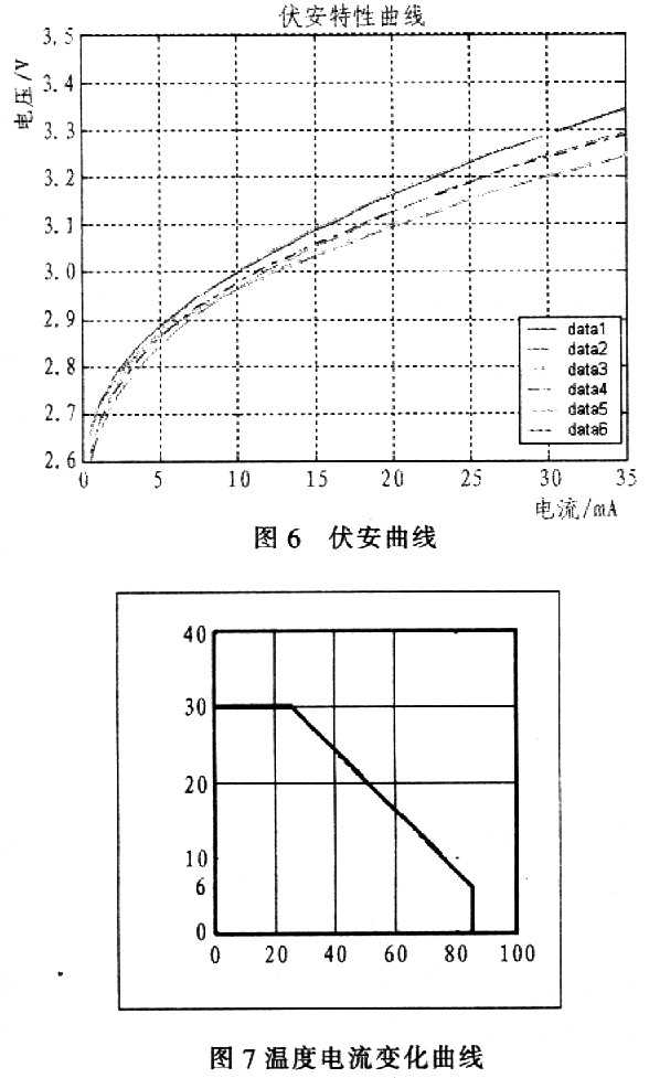 圖6和圖7分別為L(zhǎng)ED的伏安曲線(xiàn)和溫度電流曲線(xiàn)。由LED發(fā)光原理可以知道,白光LED的亮度變化主要是由其通電電流決定的。
