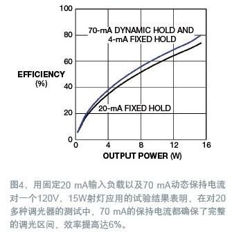 LM3450采用了這種采樣相位解碼器方法,因此只有在采樣周期內(nèi),動(dòng)態(tài)保持才有效。為驗(yàn)證這個(gè)方案,同時(shí)用一個(gè)固定的20 mA保持電流和一個(gè)大得多的70 mA動(dòng)態(tài)保護(hù)電路,做了一個(gè)120V、15W的射燈應(yīng)用(圖4)。在對(duì)20多種調(diào)光器的測(cè)試中,70 mA動(dòng)態(tài)保持法都確保了完整的調(diào)光區(qū)間,效率提高達(dá)6%。
