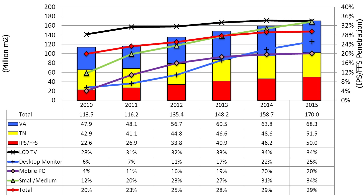 在液晶電視市場,廣視角一直是主要的賣點之一,其中IPS/FFS LCD面板的滲透率在2011年達到31%。在桌上型顯示器市場, IPS/FFS 面板傅統(tǒng)上被用在一些特殊應用,例如醫(yī)療設備,2011年滲透率為7%,而NPD DisplaySearch預測這個數(shù)字在2015年將上升到25%,主因于IPS面板的領(lǐng)導生產(chǎn)商LG Display計劃使IPS成為桌上型顯示器面板的標準。