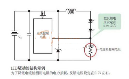 通常,開關穩(wěn)壓器IC設定的反饋電壓約為1.2V。但對于LED驅動IC,1.2V過大。因為把輸出電流轉換成電壓的數百mΩ 的電阻(電流檢測用電阻)需要與LED串聯。對于照明器具等使用的高亮度LED,流經的是1.5A和2A等大電流。如果500mΩ的電流檢測用電阻中通過1.5A的電流,僅此一項就會產生0.75W的電力損耗。因此,LED驅動IC把反饋電壓設定在了非常低的0.2V左右。這樣一來,不僅可以使用較小的電流檢測用電阻,而且在大電流通過時,也可以把電力損耗控制在較低的水平。