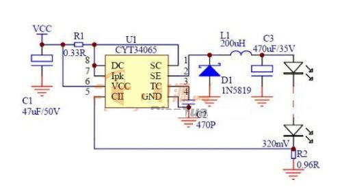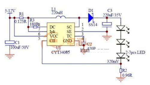 CYT34065特別適合設計3-12V升壓設計,輸出12-24V以上。也可以設計36V-24V甚至低于12V降壓驅動線路,CV或CC模式,降壓低至1.25V以上的輸出電壓。CYT34065仍然滿足輸出DC恒壓模式設計,完全兼容CYT34063應用。輸出采樣基準需要重新計算外,不需要修改原設計PCB線路。并且還能設計低于1.25V或更低的電壓范圍。
