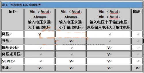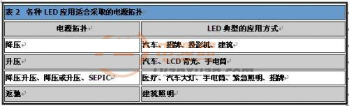 如同表2所示,LED已廣泛運(yùn)用于各領(lǐng)域,因此需要許多種類(lèi)的電源拓?fù)?,支持LED的應(yīng)用。一般而言,必須考慮輸入電壓、輸出電壓及對(duì)隔離的需求,以做出適當(dāng)選擇。