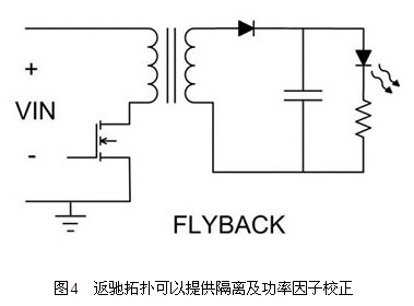 基于安全考慮,可能會(huì)規(guī)定在脫機(jī)電壓及輸出電壓之間進(jìn)行隔離。此應(yīng)用方式下,最節(jié)省成本的解決方法就是使用返馳轉(zhuǎn)換器(圖4),在所有的隔離拓?fù)渲?,這種作法所需要的組件數(shù)量最少。變壓器匝數(shù)比可用來(lái)對(duì)輸出電壓進(jìn)行降壓、升壓或降壓升壓,設(shè)計(jì)彈性很大,不過(guò)缺點(diǎn)在于電源變壓器基本上是訂制組件。此外,在FET以及輸入和輸出電容器中,也會(huì)有高組件應(yīng)力的情形出現(xiàn)。應(yīng)用固定燈光時(shí),可以使用「慢速」的回饋控制循環(huán),調(diào)節(jié)LED電流與輸入電壓同相位的情形,進(jìn)行功率因子校正(PFC)。這樣可以調(diào)節(jié)所需的平均LED電流,并能調(diào)節(jié)輸入電流與輸入電壓同相位的情形,以提供高功率因子。