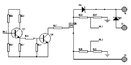 為了在夜間不同時(shí)刻采用不同的亮度,以達(dá)到節(jié)約電能的目的,本系統(tǒng)設(shè)計(jì)了兩路負(fù)載輸出,晚上12點(diǎn)以前兩盞LED皆亮,12點(diǎn)后一盞點(diǎn)亮,每路輸出均有立的控制和檢測。設(shè)計(jì)采用了PWM功率控制功能對LED燈具實(shí)現(xiàn)無級調(diào)光。單路原理如圖3所示。其中單片機(jī)P0.6 口給出控制信號, 即P 0 . 6 = 1 時(shí), 三極管導(dǎo)通,繼電器閉合,MOS管導(dǎo)通,蓄電池向路燈供電。在電量不足或白天時(shí),控制端輸出低電平信號,切斷供電回路。夜晚蓄電池電量不足情況下由市電供電系統(tǒng)給LED路燈供電,保證系統(tǒng)的完整和可靠。