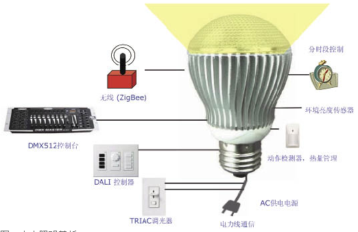 未來(lái)照明革新市場(chǎng)潛力巨大,如圖1所示。分時(shí)段控制是指在不同時(shí)間段有不同的亮度。環(huán)境亮度傳感器可以靈活應(yīng)對(duì)燈具所處環(huán)境的亮度,比如天陰的時(shí)候天黑的比平常早,那么路燈就會(huì)提前打開(kāi)。動(dòng)作傳感檢測(cè)器是指夜晚的時(shí)候如果燈具周圍無(wú)人活動(dòng)時(shí),會(huì)調(diào)低亮度,當(dāng)檢測(cè)到有人活動(dòng)時(shí),就會(huì)調(diào)高亮度。另外,現(xiàn)代照明需要有多重通信方式,除了無(wú)線方式以外,DALI或DMX512等先進(jìn)的照明專用通信協(xié)議使得燈具的管理更加便捷,電力線載波通信(PLC)也是近年來(lái)備受關(guān)注的方向。