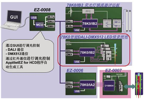 瑞薩電子的照明參考方案由3部分組成,可通過(guò)PC端GUI進(jìn)行調(diào)光控制,PC和通信板通過(guò)USB線連接,情景照明板和通信板之間可以由紅外、DALI及DMX512三種方式實(shí)現(xiàn),在瑞薩電子的照明參考方案中,可以使用AppliletEZ for HCD程序自動(dòng)生成工具,實(shí)現(xiàn)照明控制程序的涉及、編譯和燒寫。照明參考方案如圖5所示。