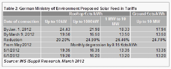 對于2012和2013年,德國政府確認的年度安裝目標是2.5-3.5GW,從2014年開始,該目標將每年下調(diào)400MW。表2所示為德國環(huán)境部所建議的FIT體系。