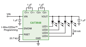 LED越來越多地應用于拍照手機、智能手機和氙氣燈泡替代,且光輸出能力不斷提供,從而滿足更高的性能需求。安森美半導體的CAT3612、CAT4131、CAT4134和CAT3224都是這類驅動方案。這些器件分別采用電荷泵、電感升壓拓撲結構,可以提供不同的閃光電流和亮度。