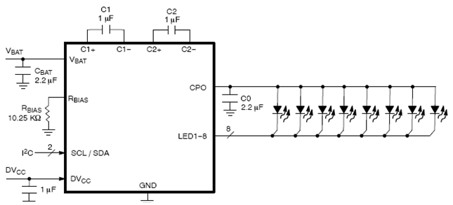 以多通道LED驅動器NCP1840為例,該器件能夠幫助用戶創(chuàng)建任何照明圖形,獨立驅動多達8顆LED。由于處理器不再需要直接控制各個獨立LED,采用NCP1840可簡化通常由其系統(tǒng)設計中處理器來完成的工作;通過統(tǒng)一控制各個LED亮度及閃爍率的串行接口寫入寄存器或讀取寄存器,能夠方便地進行電流及調光程度編程。LED亮度程度能以對數(shù)而非線性形式控制,從而使肉眼觀看也沒有亮度失真。NCP1840采用高能效、低噪聲四模電荷泵,能夠延長電池使用時間,非常適合便攜式應用。