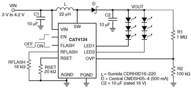 以CAT4134為例,這是一款大功率電感升壓型雙通道驅動轉換器,提供2路匹配的LED電流。輸出電流級別通過2個電阻之一RSET或RFLASH來控制。當FLASH輸入引腳為低(電影模式),電阻RFLASH設置LED電流。每個通道驅動2或3個白色串聯(lián)LED,并提供1個可調節(jié)電流以控制其亮度。支持輸入電壓低至3V,使得器件適合于鋰離子電池的應用。
