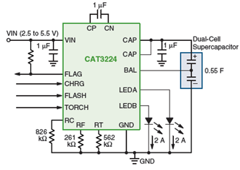 電荷泵型驅動器CAT3224也適合相機閃光應用,從而支持高百萬像素相機閃光,以及替代氙氣閃光,配合纖薄設計。CAT3224是業(yè)界首款4 A單芯片超級電容LED驅動器,集成了雙模1x/2x電荷泵,提供三項關鍵功能:精密的超級電容充電控制、電流放電至LED閃光的管理,以及為LED手電筒模式提供恒流。這三種模式的工作電流均可以3個外部電阻來簡易編程,提供達4 A的LED閃光脈沖電流。超級電容技術的高峰值電流優(yōu)勢,結合CAT3224簡單的并行邏輯接口,使該器件非常適用于采用LED替代氙氣燈的應用。