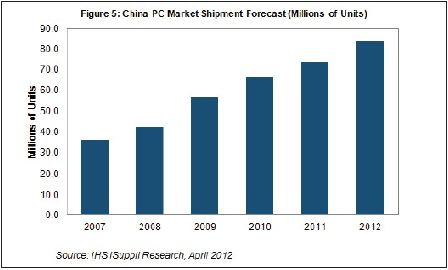 IHS公司預(yù)測,2012年中國占全球臺式PC出貨量的份額將從2011年的7%上升到11%。
