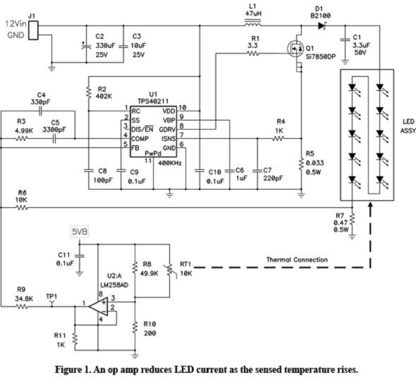 圖1 檢測(cè)溫度上升時(shí)運(yùn)算放大器降低LED電流。
