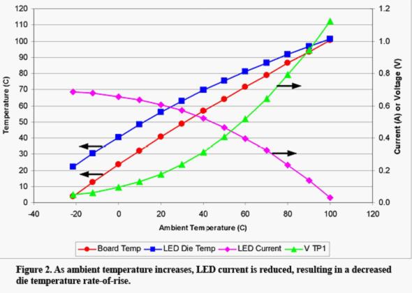 圖2 環(huán)境溫度上升,LED電流降低,從而達(dá)到更低的芯片溫升速率。