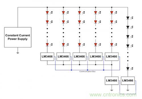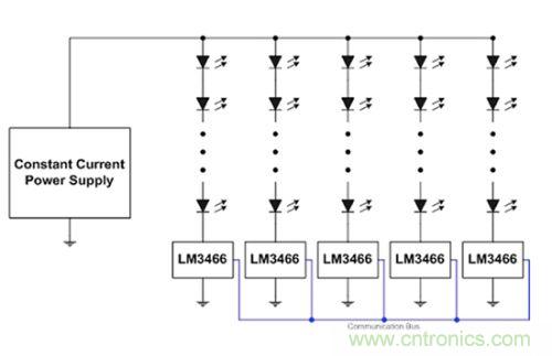 在本應(yīng)用中,LM3466 集成電路可互相通信,確保恒定電流電源所強(qiáng)加的輸入電流能夠在各串之間進(jìn)行平均分配。線性穩(wěn)壓器會吸收 LED 堆棧正向電壓的任何差異。
