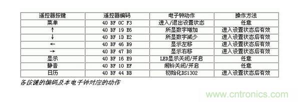 遙控器采用長(zhǎng)虹彩電K11F型遙控器,遙控器按照16位地址碼,8位數(shù)據(jù)碼以及8位數(shù)據(jù)碼的反碼發(fā)送。表一列出了各按鍵的編碼及本電子鐘對(duì)應(yīng)的動(dòng)作。如果采用其他遙控器,需對(duì)程序相應(yīng)部分的編碼作修改。
