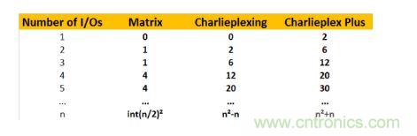 我們可以講這種新的方案成為“查理復用+(Charlieplex Plus)”。分析表明,依靠這樣的技術,一個I/O口可以比普通的查理復用技術多控制兩個LED。也就是說n個I/O口所能控制的LED數(shù)量就為2n+n²-n = n²+n。具體情況如上表所示。