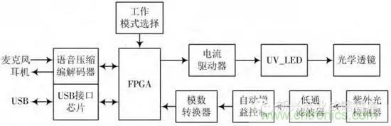 系統(tǒng)的核心部件是UV?LED和紫外光檢測器,此外還有一片可編程邏輯陣列(FPGA),外接語音壓縮編解碼芯片和USB接口芯片,分別用來支持語音和數(shù)據(jù)的傳輸,如圖1所示。