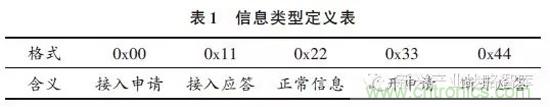 以容量為10人的紫外光語音通信系統(tǒng)為例說明數(shù)據(jù)幀結(jié)構(gòu)的設(shè)計??紤]到通常情況下人講話的語速為每分鐘160~180個漢字,在保留一定余量的情況下,假設(shè)每分鐘240個漢字,如果壓縮后的語音信號速率為4.8Kb/s,可以算出平均每個漢字時間內(nèi)的比特數(shù)為1200b。據(jù)此設(shè)計的數(shù)據(jù)幀結(jié)構(gòu)如圖3所示,其中數(shù)據(jù)的信息速率為60Kb/s,信息體長度為1200b,時隙頭長度為96b。時隙頭包括前導(dǎo)序列、信息類型、發(fā)送方代號和接收方代號,長度分別為72b,8b,8b和8b。每一個用戶只處理接收代號和自己的代號一致的時隙。收發(fā)雙方作為一個組合占用相鄰的兩個時隙。前導(dǎo)序列為0,1交替的序列,信息類型的定義如表1所示。