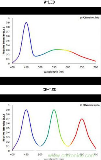 不管是投影儀還是電視機(jī)都采用的是RGB-LED光源,也就是紅黃藍(lán)三色LED光源,而這3種顏色的LED,以“藍(lán)光LED”最為重要,減弱藍(lán)光則會(huì)使色彩失真,整體畫面色調(diào)偏紅黃。一起看看LED顯示器兩種主要發(fā)光模塊W-LED(常用)和GB-LED的光譜組成。如下圖: