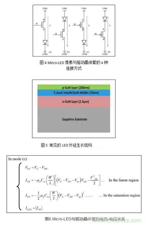 圖4(a)中Micro-LED像素連接在N型驅(qū)動(dòng)晶體管的源極(Source)。由外延生長(zhǎng)(Epitaxial Growth)、制備工藝、及器件老化所產(chǎn)生的不均勻性所導(dǎo)致的Micro-LED電學(xué)特性的不均勻性將會(huì)直接影響驅(qū)動(dòng)晶體管的VGS,從而造成顯示圖像的不均勻。而圖4(c)中的Micro-LED像素連接在P型驅(qū)動(dòng)晶體管的漏極(Drain),可以避免上述影響,其電流-電壓關(guān)系圖6所示。因此,有P管像素電路驅(qū)動(dòng)Micro-LED較為適宜。