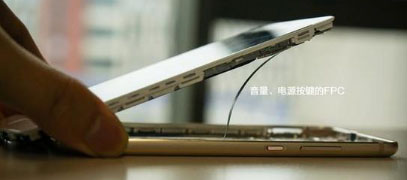注意音量、電源按鍵的FPC,接口在主板側(cè)。按鍵不直接放在主板上還是有點(diǎn)講究的,因?yàn)榻饘贆C(jī)身遭遇不慎的話可能會變形,而變形后主板與按鍵(鍵帽)之間容易出現(xiàn)錯(cuò)位從而影響按鍵手感/功能,因此把按鍵整合在后殼上,再用FPC連接主板,怎么摔按鍵也能按。