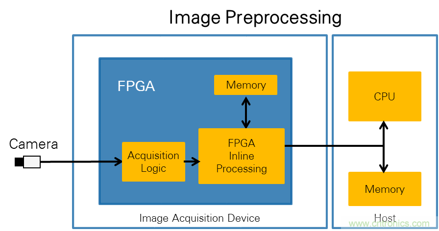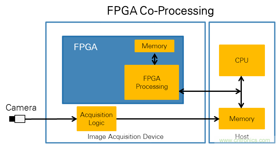 圖2.在嵌入式FPGA處理架構(gòu)中,您可以將相機(jī)接口直接連接到FPGA的引腳,以便像素可直接從相機(jī)發(fā)送到FPGA。