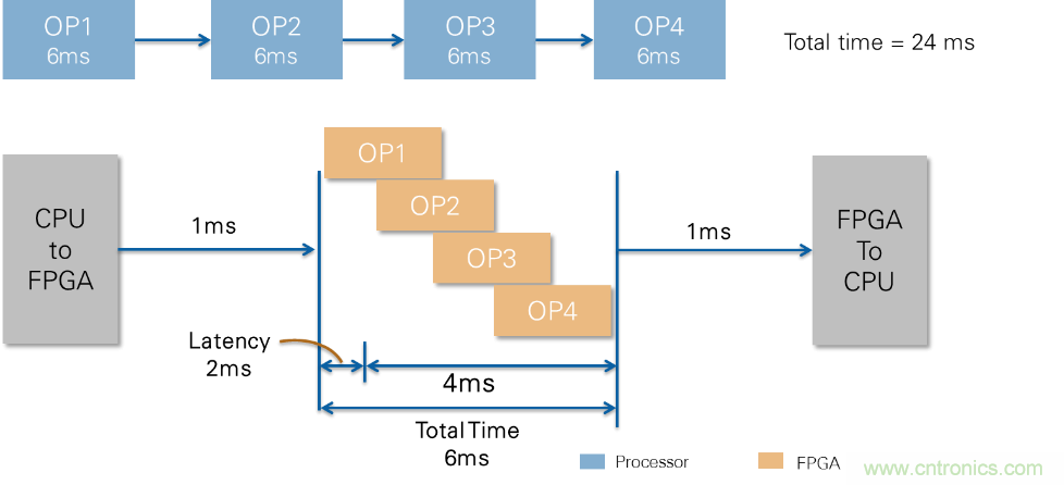 CPU按順序執(zhí)行操作,因此第一個(gè)操作必須在整個(gè)圖像上運(yùn)行結(jié)束后,第二個(gè)操作才能啟動(dòng)。在本例中,假設(shè)算法中的每個(gè)步驟在CPU上運(yùn)行需要6ms;因此,總處理時(shí)間是24毫秒。現(xiàn)在考慮在FPGA上運(yùn)行相同的算法。由于FPGA本質(zhì)上是大規(guī)模并行的,所以該算法中的四個(gè)操作可以同時(shí)對(duì)圖像中的不同像素上操作。這意味著接收第一個(gè)處理的像素僅需2ms的時(shí)間,處理整個(gè)圖像需要4ms的時(shí)間,因而總處理時(shí)間為6ms。這比CPU的執(zhí)行速度快得多。即使使用FPGA協(xié)處理架構(gòu)并將圖像傳輸?shù)紺PU,整個(gè)處理時(shí)間(包括傳輸時(shí)間)也比單獨(dú)使用CPU要短得多。