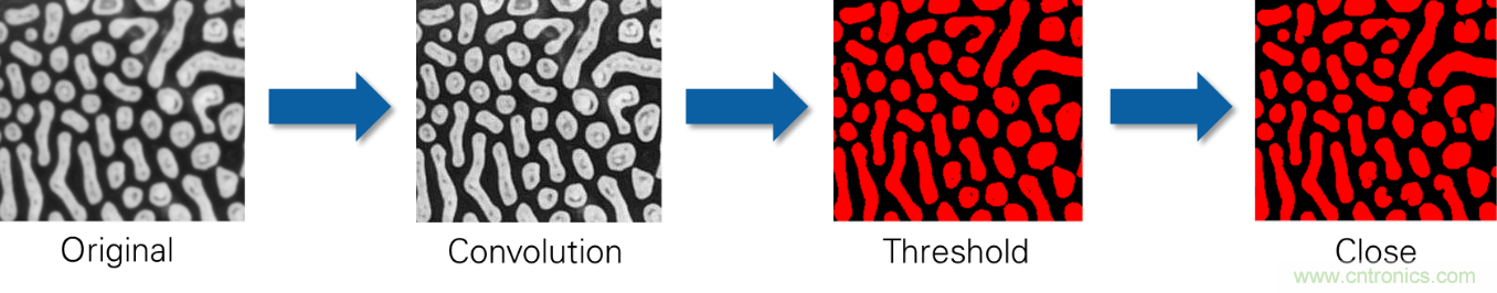 現(xiàn)在考慮一個(gè)真實(shí)的例子,比如粒子計(jì)數(shù)所需的圖像。首先需要應(yīng)用卷積濾鏡來銳化圖像。接下來,通過閾值運(yùn)行圖像以生成二進(jìn)制圖像。這不僅可以通過將其從8位單色轉(zhuǎn)換為二進(jìn)制來減少圖像中的數(shù)據(jù)量,還可以為二進(jìn)制形態(tài)學(xué)應(yīng)用準(zhǔn)備圖像。最后一步是使用形態(tài)學(xué)來應(yīng)用關(guān)閉功能。這會(huì)去除二進(jìn)制粒子中的任何孔。