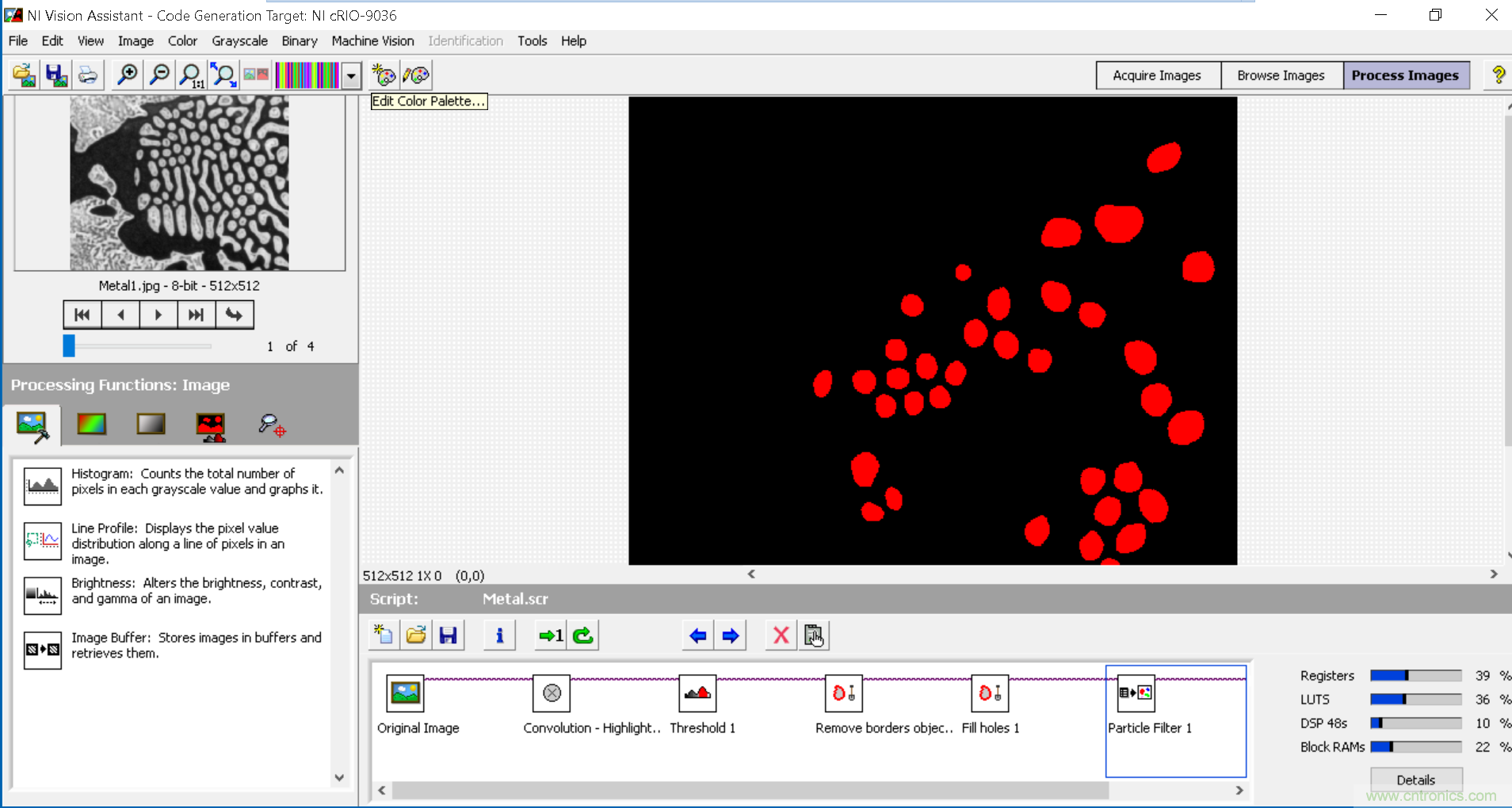 為了實(shí)現(xiàn)生產(chǎn)率的最大化,不論使用哪種處理平臺(tái),都需要立即獲得關(guān)于算法的反饋和基準(zhǔn)測(cè)試信息。當(dāng)使用迭代探索性方法時(shí),實(shí)時(shí)查看算法結(jié)果將會(huì)節(jié)省大量時(shí)間。什么是正確的閾值?用二進(jìn)制形態(tài)濾波器剔除的顆粒多大或多?。磕姆N圖像預(yù)處理算法和算法參數(shù)可以最好地清理圖像?這些都是開發(fā)視覺算法時(shí)的常見問題,而關(guān)鍵在于是否能夠更改并快速查看結(jié)果。然而,傳統(tǒng)的FPGA開發(fā)方法可能會(huì)減緩創(chuàng)新,因?yàn)樗惴ǖ拿總€(gè)設(shè)計(jì)變化之間需要編譯時(shí)間??朔@一點(diǎn)的一個(gè)方法是使用一個(gè)算法開發(fā)工具,可讓您在同一個(gè)環(huán)境進(jìn)行CPU和FPGA的開發(fā)工作,而不會(huì)在FPGA編譯時(shí)陷入困境。NI Vision Assistant是一種算法工程工具,用于開發(fā)部署到CPU或FPGA上的算法,以幫助您簡(jiǎn)化視覺系統(tǒng)設(shè)計(jì)。您還可以使用Vision Assistant在目標(biāo)硬件上編譯和運(yùn)行之前測(cè)試算法,同時(shí)輕松訪問吞吐量和資源利用率信息。