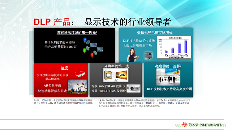 “在顯示應(yīng)用領(lǐng)域,DLP技術(shù)涵蓋范圍非常廣,從小巧的口袋型顯示器到高端大型的數(shù)字影院,TI一直保持大量的產(chǎn)品和技術(shù)創(chuàng)新。”Ane Sacks女士在會(huì)議中介紹到,“如今,TI已經(jīng)能夠?qū)崿F(xiàn)最高幀速率和最高亮度的快速投影顯示技術(shù),面向快速動(dòng)作視頻和游戲市場;在面板分辨率上推出了入門級(jí)的4K平臺(tái),與此同時(shí)在1080P上也有十足的創(chuàng)新,推出了超高性價(jià)比的1080p Pico解決方案,未來市場潛力巨大。”