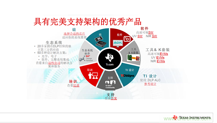 “為加速滲透民用主流市場,TI不僅推出了性能優(yōu)異的產(chǎn)品,還建立了一流的支持架構(gòu),以借助廣大TI用戶加快產(chǎn)品面市。”Ane Sacks女士還表示,“針對TI的IC和DLP芯片組,TI可以提供軟件、工具套件、參考設(shè)計(jì)、工程社區(qū)交流、技術(shù)培訓(xùn)以及完善的DLP生態(tài)系統(tǒng)等技術(shù)支持,包含20多家擁有DLP經(jīng)驗(yàn)的獨(dú)立第三方供應(yīng)商以及50多種光學(xué)、電子、軟件等方面的設(shè)計(jì)解決方案,能夠?qū)⒆钚碌膭?chuàng)新、產(chǎn)品和應(yīng)用及時(shí)、快速地傳遞給客戶。”